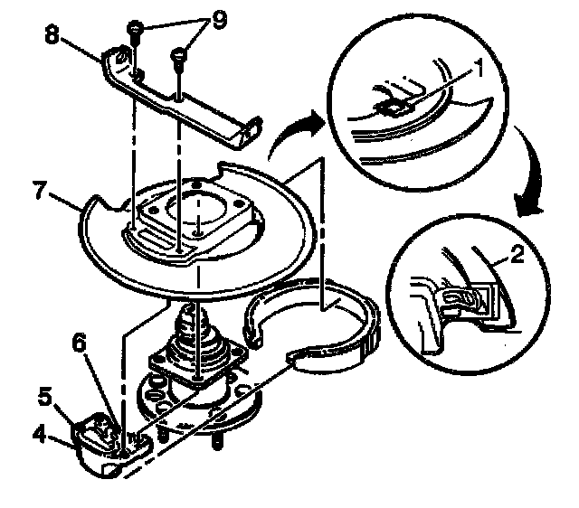 1. Install the park brake shoe and actuator (4) onto the backing plate (7).