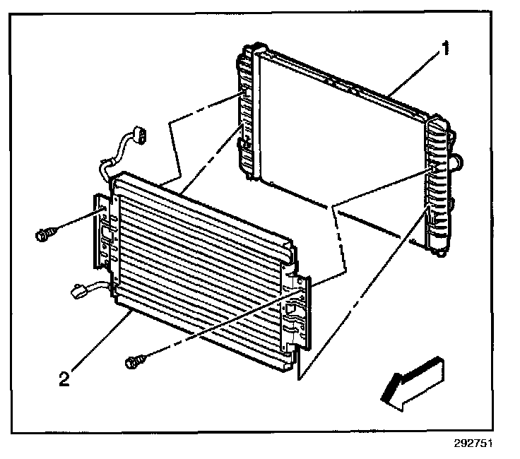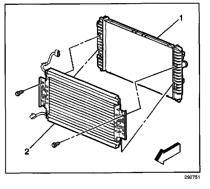 9. Remove the condenser bolts (2) from the radiator (1).