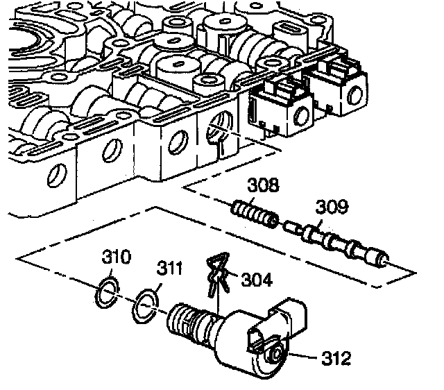1. Install the torque signal regulator spring (308), the torque signal regulator valve (309), the Pressure Control Solenoid (PCS) with two O-rings and screen (312, 309, 310) and the PCS retainer clip (304)