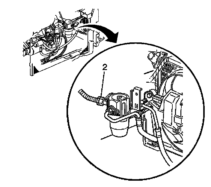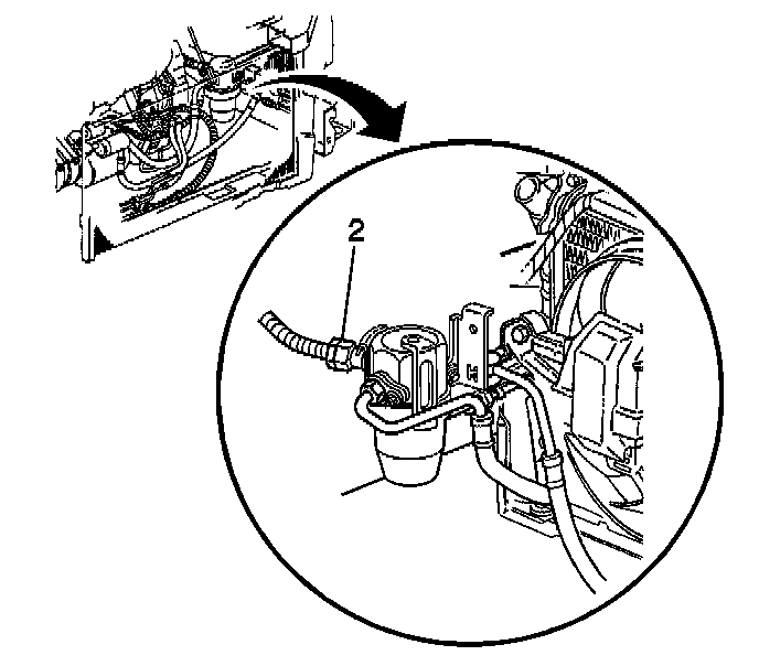 3. Loosen the suction hose nut (2) at the accumulator.