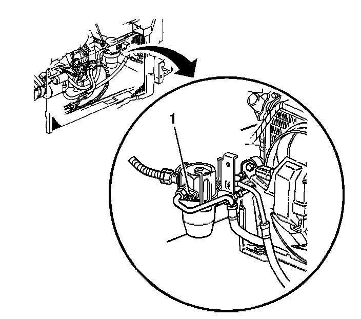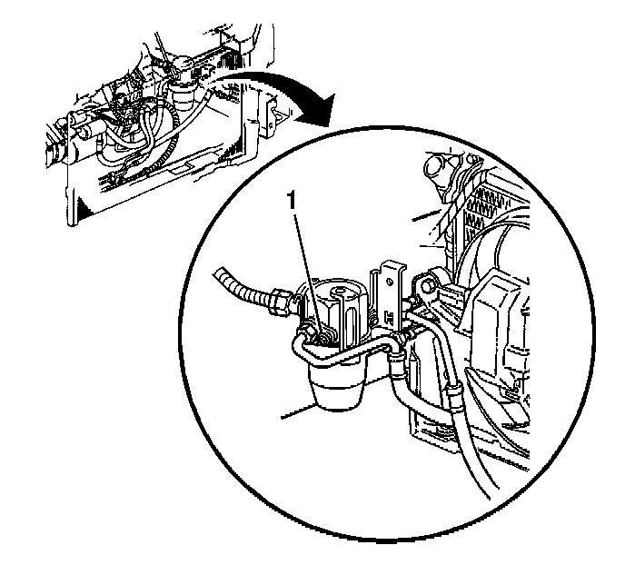 5. Remove the A/C compressor hose block fitting nut (1) from the accumulator.