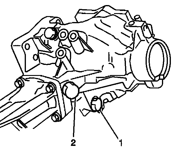 13. Add approximately 0.8 liters (1.7 pints) of 80W-90 API GL5 lubricant, or the equivalent, into the transfer case oil level/filler plug hole. The oil level should be even with the bottom of the oil level/filler plug hole (2).