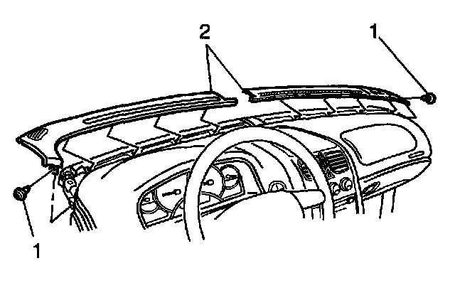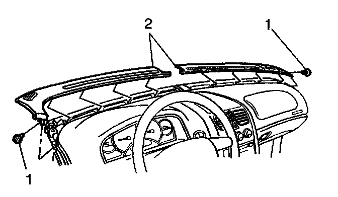 2. Remove the screw (1) attaching each windshield defroster grille (2) to the instrument panel.