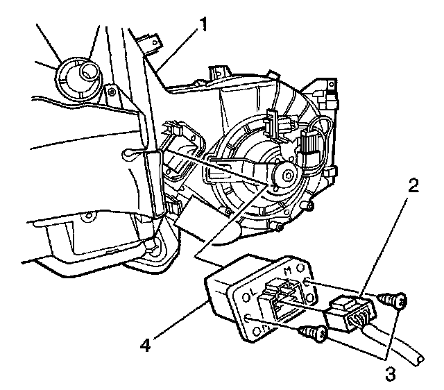 2. Disconnect the wiring harness electrical connector (2) from the blower motor resistor (4).