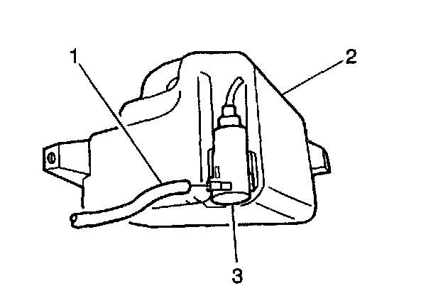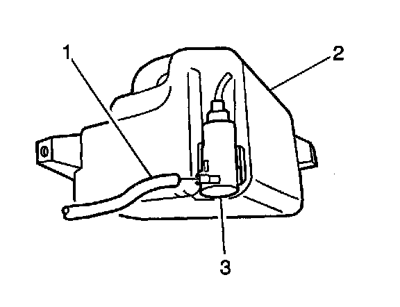 3. Reach between the front bumper fascia assembly and the washer solvent container (2) and disconnect the washer solvent hose (1) from the washer pump assembly (3).
