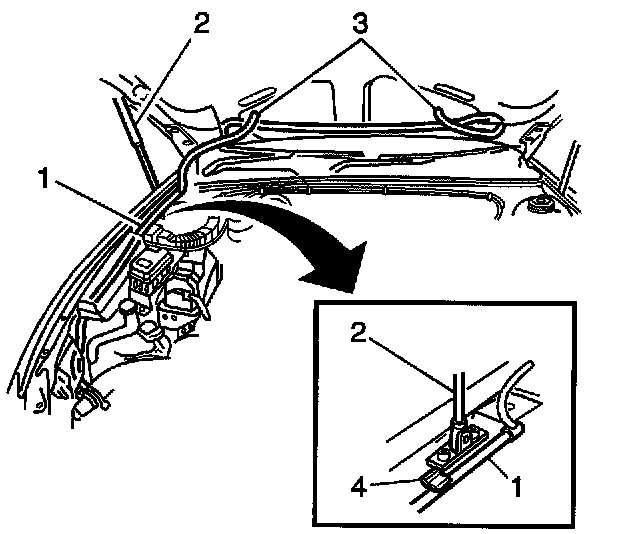 5. Remove the washer hose (1) from behind the fuse panel, and unclip (4) the hose adjacent to the hood strut (2).
