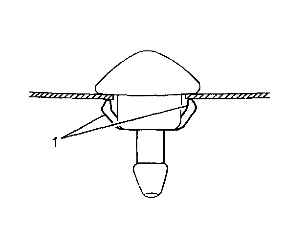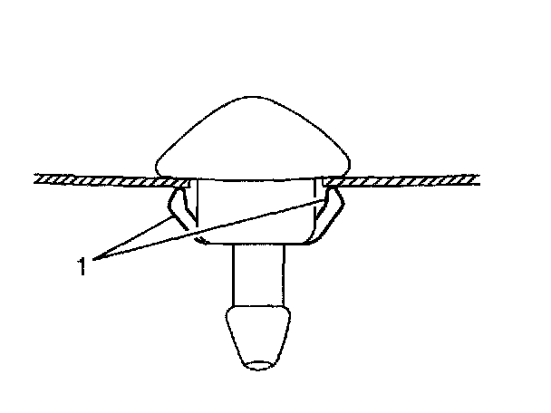 2. From the underside of the hood, squeeze the retaining tabs (1) on the base of the washer nozzle assembly, and push the nozzle out through the top of the hood.