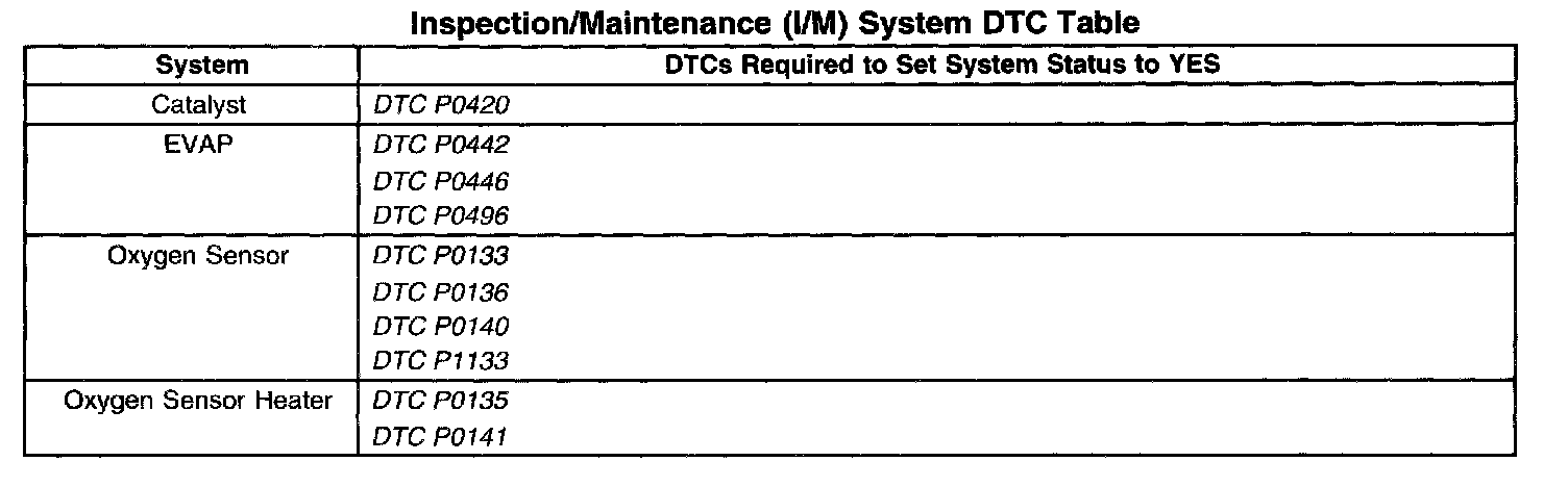 INSPECTION/MAINTENANCE (I/M) SYSTEM DTC TABLE