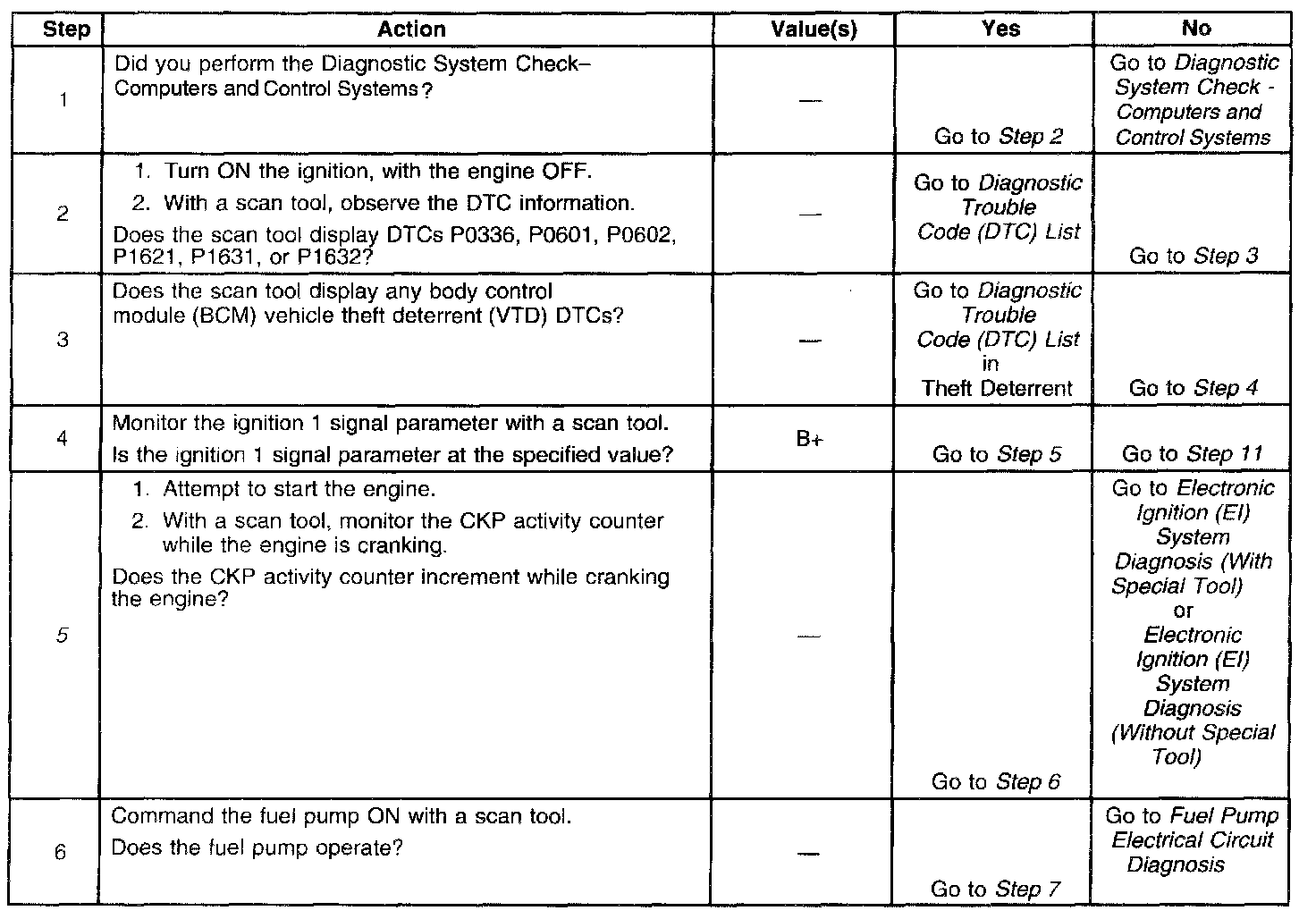 The Engine Cranks but Does Not Run diagnostic table is an organized approach to identifying a condition that causes an engine not to start. The Engine Cranks but Does Not Run diagnostic table directs the service technician to the appropriate system diagnosis. The Engine Cranks but Does Not Run diagnostic table assumes the following: