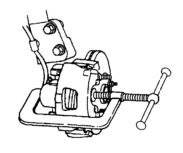 7. Install a large C-clamp over the body of the brake caliper with the C-clamp ends against the rear of the caliper body and against the outboard brake pad.