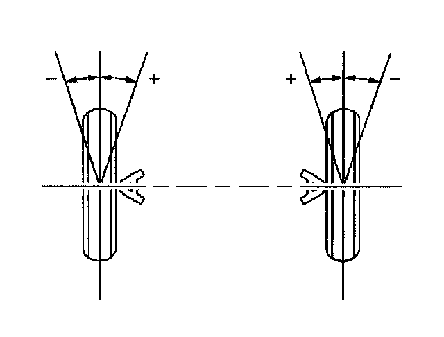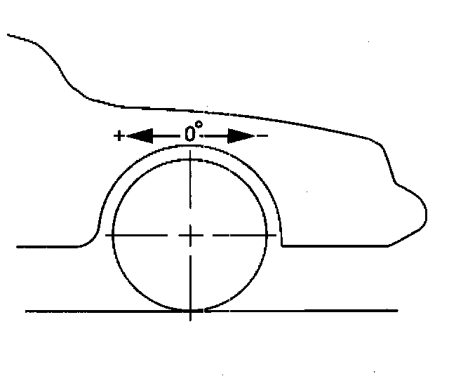 Camber is the tilting of the wheels from the vertical when viewed from the front of the vehicle. When the wheels tilt outward at the top, the camber is positive (+). When the wheel tilts inward at the top, the camber is negative (-). The amount of tilt is measured in degrees from the vertical. Camber settings influence the directional control and the tire wear.