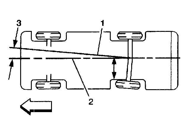 In the illustration, toe-in is shown on the left rear wheel, moving the thrust line (1) off center. The resulting deviation from the centerline is the thrust angle,