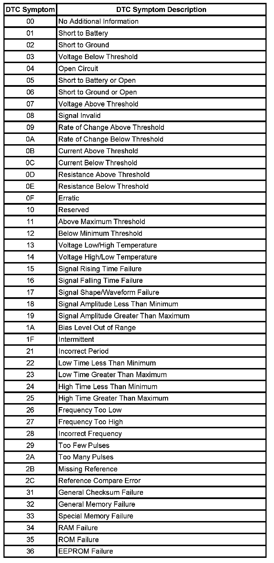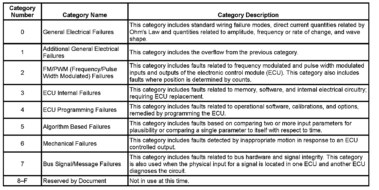 The DTC symptom is made up of 2 alphanumeric digits. The first digit following the DTC indicates the DTC symptom category. There are 16 possible categories available in the range of 0 through the letter F. Currently there are 8 categories in use, 0 through 7. These 8 categories together with their definitions are given below.