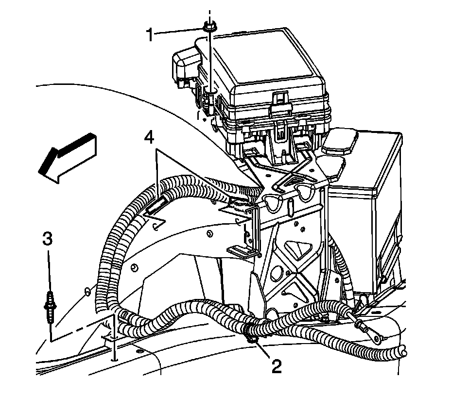 6. Remove the negative battery cable clips (4) from the wheelhouse liner.
