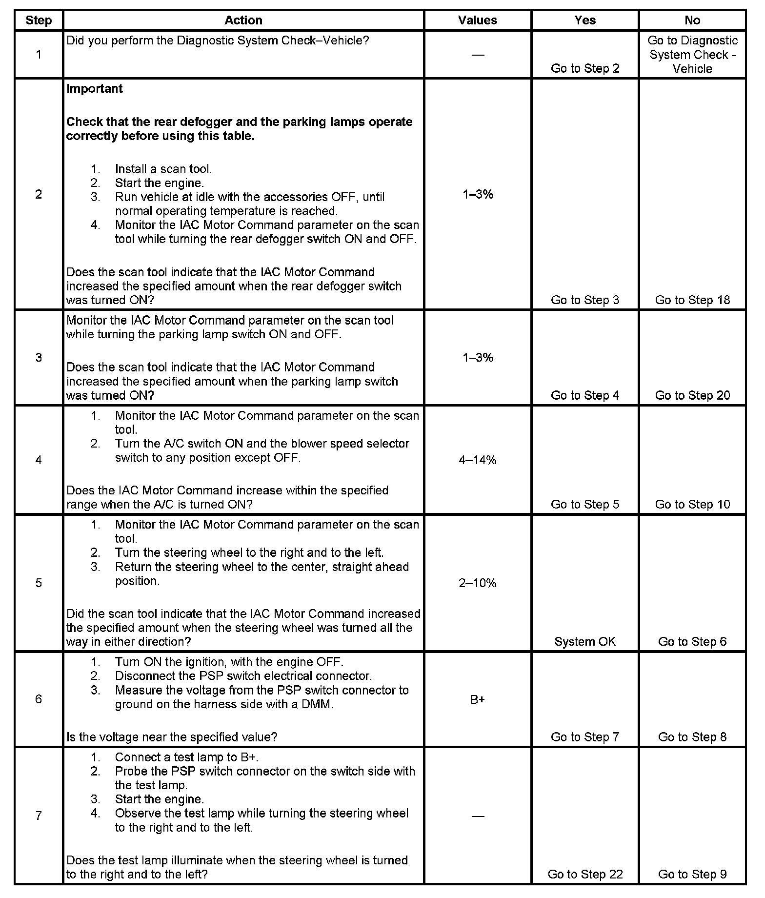 5. This step verifies the operation of the power steering pressure (PSP) switch circuit. If the engine idle speed and IAC Motor Command increase when the steering wheel is turned to 90 percent, the PSP switch idle circuit is functioning normally.