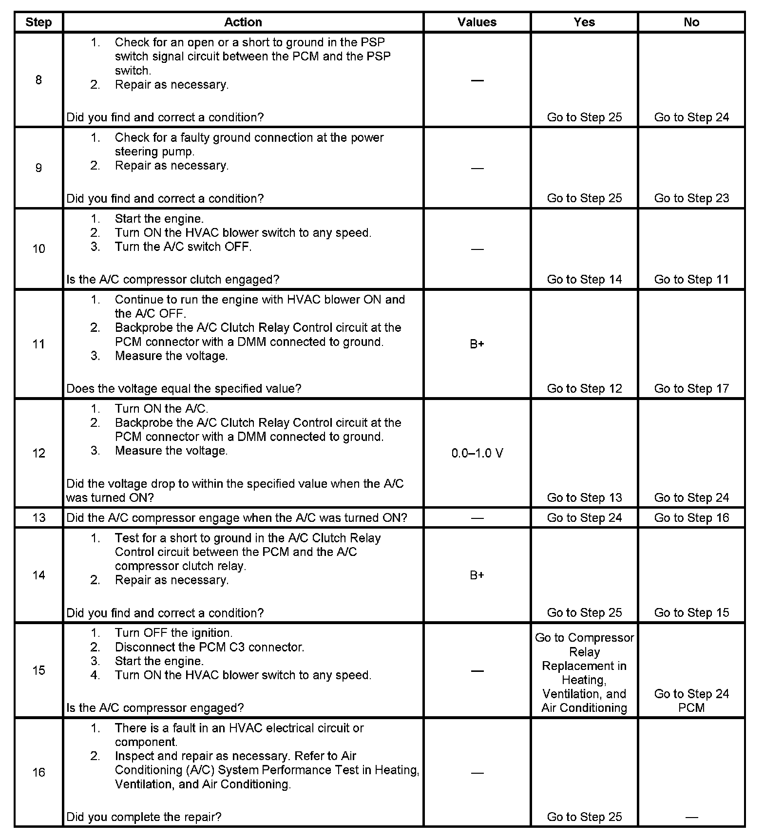 13. If the A/C compressor clutch engages, the compressor clutch, the relay, and the control circuit are all OK. The PCM will then need to be replaced because there was no increase in the IAC motor command percentage during A/C operation in Step 4.