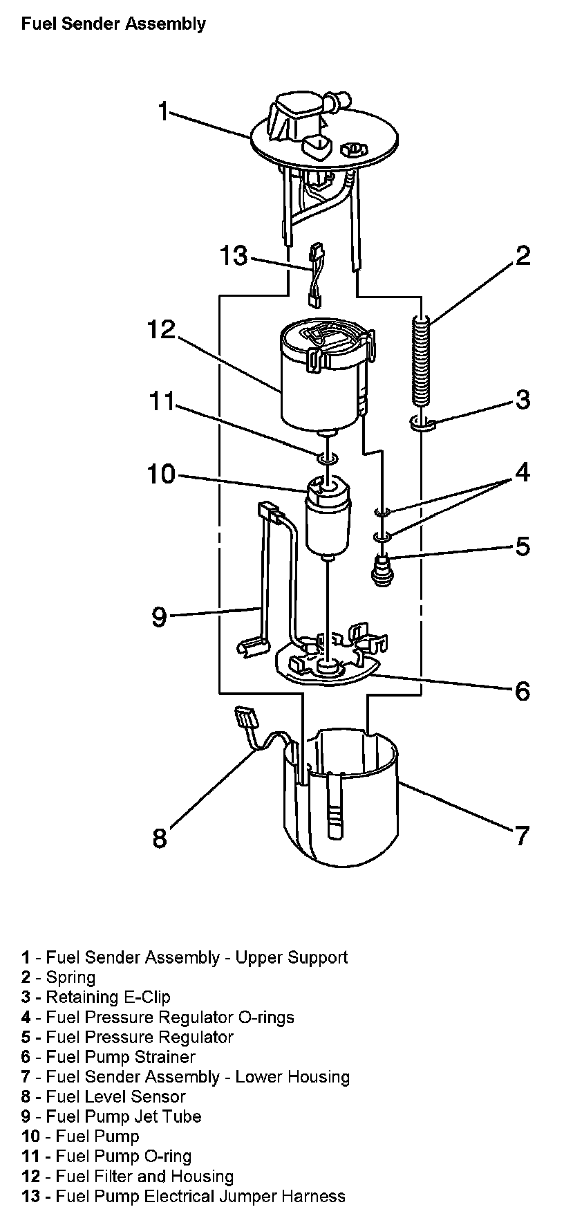 The fuel sender assembly is located in the fuel tank. The fuel sender assembly contains the electric fuel pump, the fuel level sensor, the fuel pressure regulator, and the fuel filter. Most of the fuel sender assembly components can be serviced separately.
