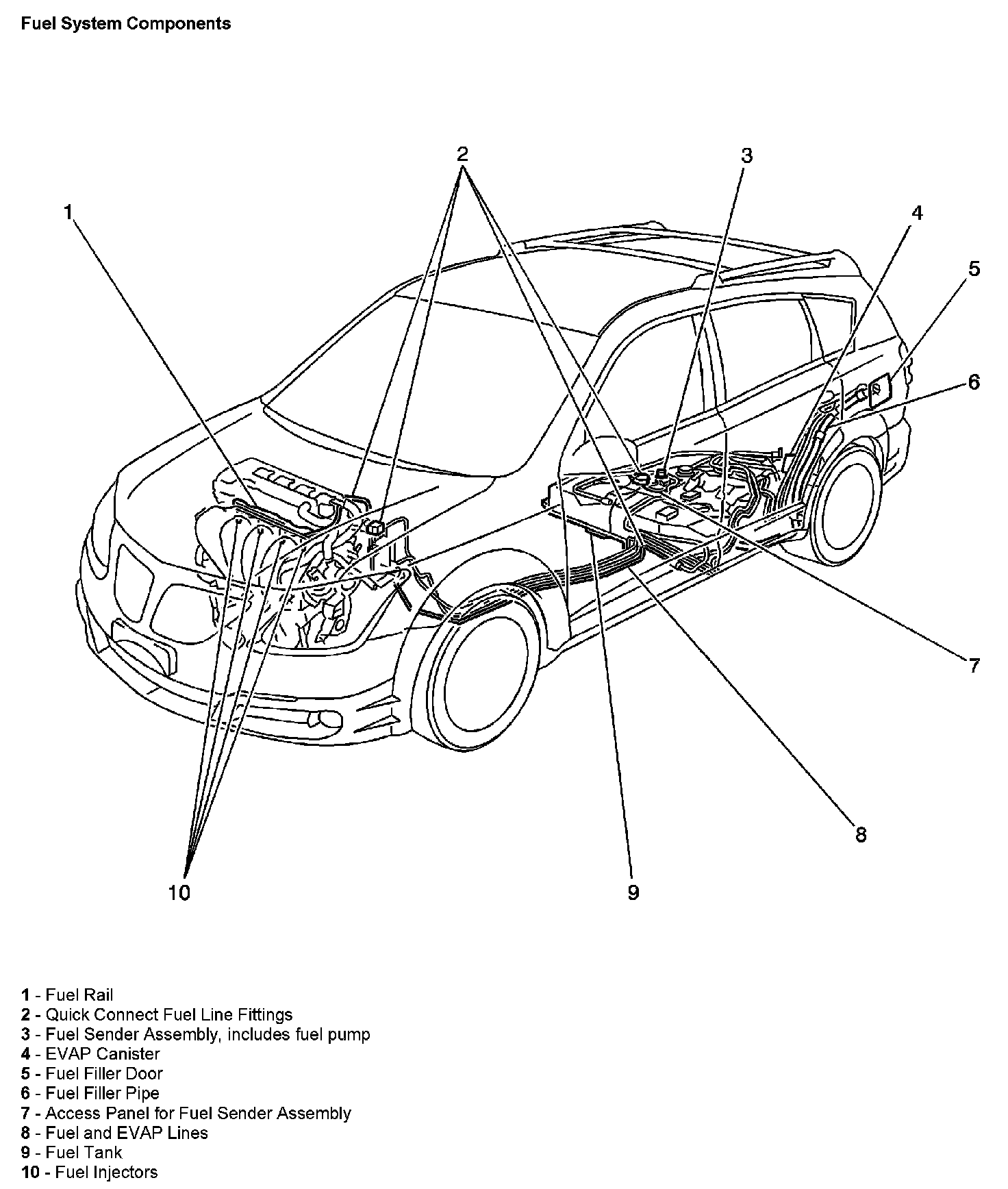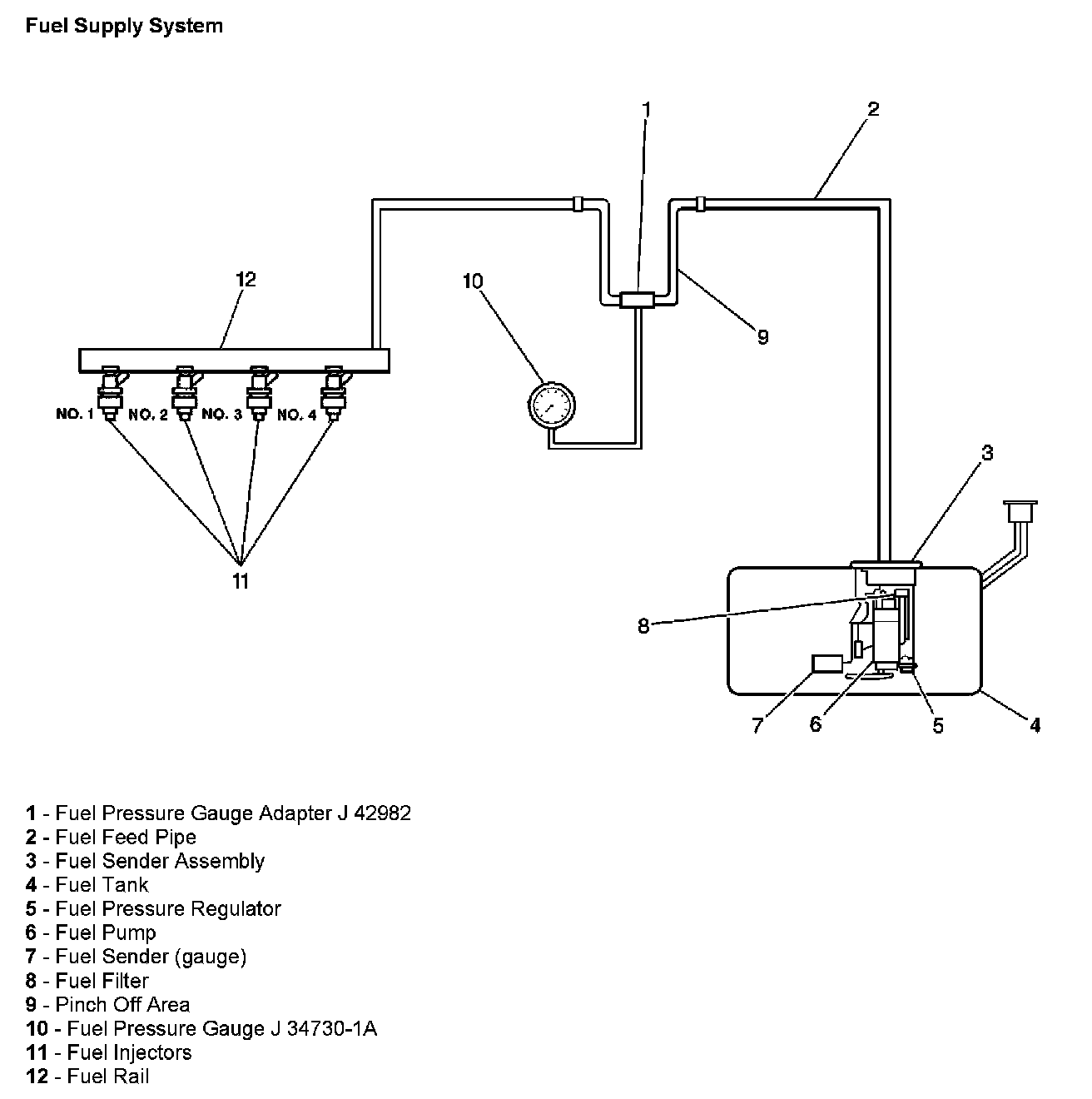 The supply of fuel is stored in the fuel tank. An electric fuel pump pressurizes the fuel through to the fuel filter and out to the fuel lines and the fuel rail. The electric fuel pump is suspended from the top of the fuel tank as part of the fuel sender assembly. The fuel pump is designed to provide fuel at a pressure above the regulated pressure needed by the fuel injectors. The fuel pressure regulator keeps the fuel supplied to the fuel injectors at the regulated pressure.