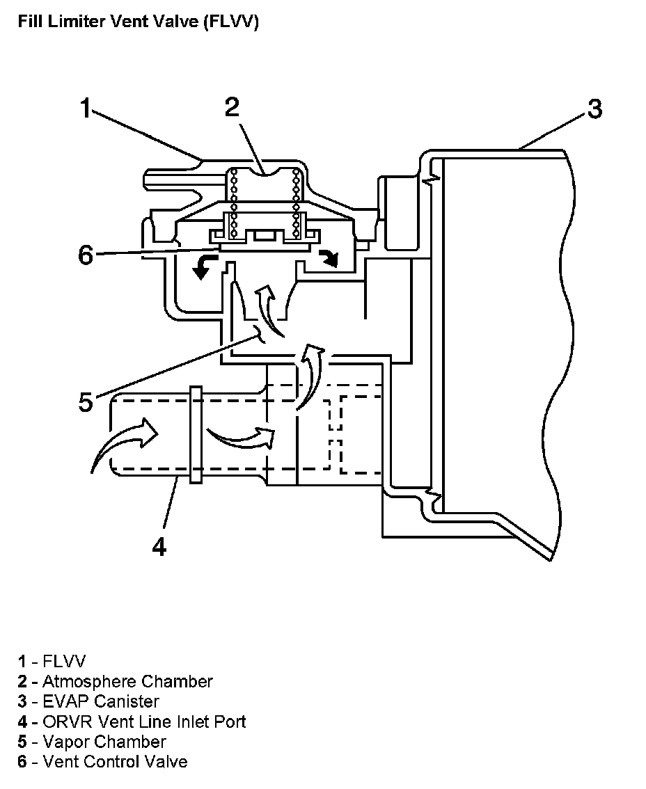 The fill limiter vent valve (FLVV) (1) is an integral part of the EVAP canister (3). The cross sectional view shows the path of fuel vapors passing thru the valve directly into the EVAP canister. When the fuel filler cap is removed during refueling, the atmosphere chamber (2) fills with atmospheric pressure that has entered thru the port from the fuel filler pipe. The pressure in the atmosphere chamber (2) opens the passage to the vapor chamber (5) by opening the vent control valve (6). Refueling causes the internal pressure in the fuel tank to increase, pushing fuel vapors into the ORVR port (4) and up thru the vent control valve (6) into the EVAP canister (3). When the fuel tank is full, the tank vapor control valve (5) closes, sealing off the passage into the EVAP canister.
