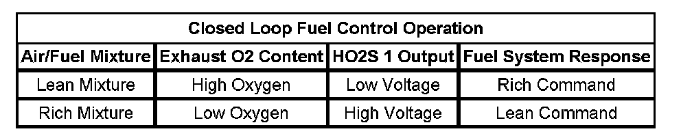 In order to obtain the most efficient engine performance with a good balance of power and fuel economy, the air/fuel mixture must be kept as close to the theoretical air/fuel ratio of 14.7:1 as possible. Maintaining the 14.7:1 air/fuel ratio also provides efficient operation of the 3-way catalytic converter (TWC) and a high clarification rate of CO, HC and NOx in the exhaust gas stream, In order to accomplish this the PCM first compares the input voltage from the heated oxygen sensor 1 (HO2S 1) with a specified reference voltage.