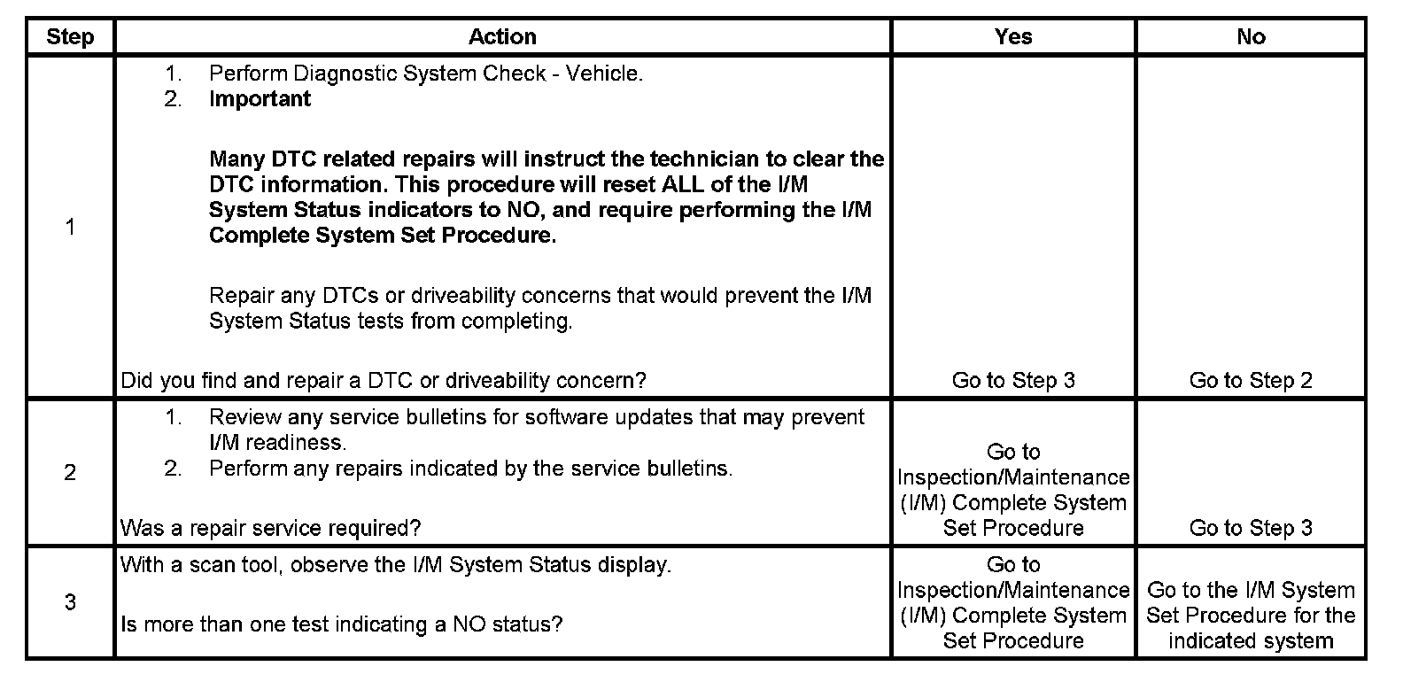 1. Any DTCs set, even those that are not listed in the Inspection/Maintenance System DTC Table, may prevent the required DTCs from running. If there is any question as to whether a set DTC is disabling the required I/M diagnostic, review the Conditions for Running in the diagnostic procedures for the DTC required by the I/M diagnostic. A list of disabling DTCs, if applicable, is contained in the supporting text for that DTC.