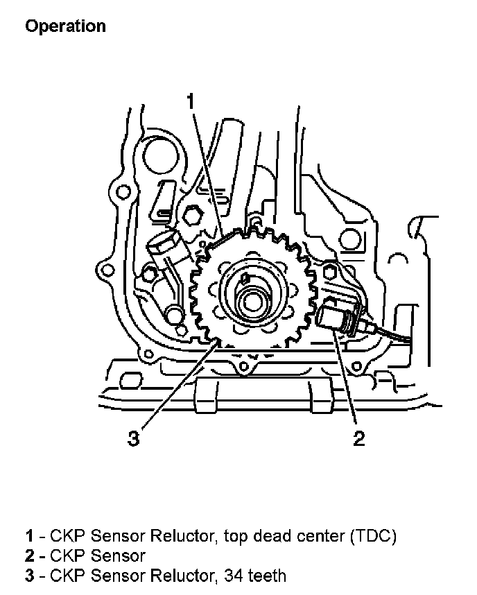 The CKP sensor reluctor (3) has 34 teeth and is mounted on the crankshaft behind the timing chain cover and the crankshaft pulley. When the crankshaft rotates, the CKP sensor signal rotor teeth pass by the CKP sensor (2) causing a fluctuation in the sensors magnetic field. The fluctuation in the magnetic field induces a voltage in the CKP sensor circuitry that corresponds to every 10 degrees of crankshaft rotation. The reluctor has one wide tooth (1) that indicates top dead center (TDC) of the number 1 cylinder. With the information that the PCM receives from the CKP sensor, the PCM determines engine speed and crankshaft position.