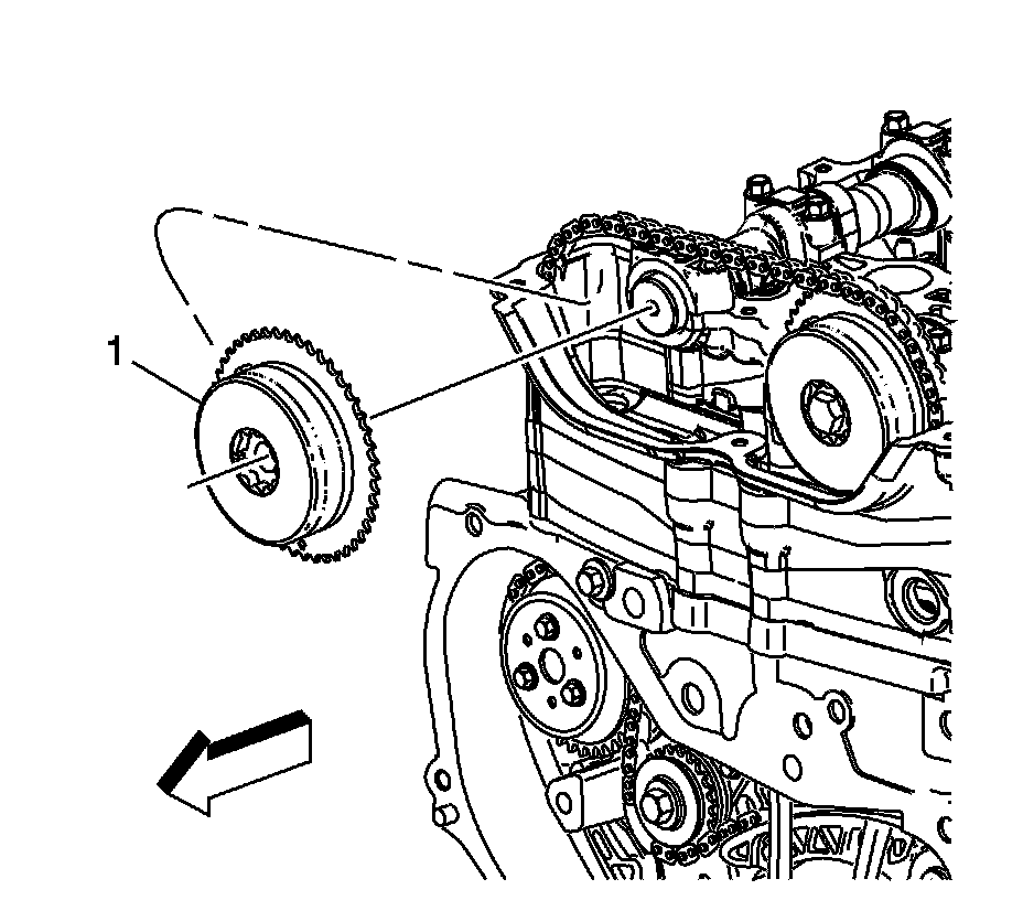 12. Install the exhaust camshaft actuator (1) into the timing chain with the timing mark lined up with the second matching colored link.