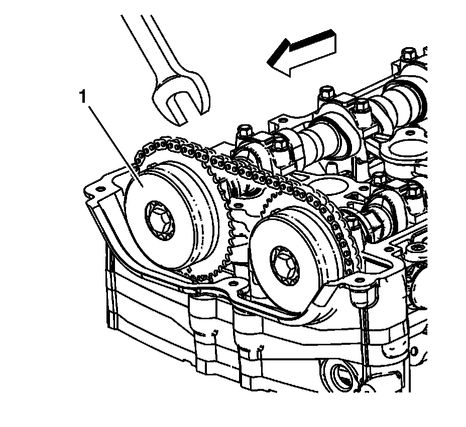 14. Using a 23-24 mm open end wrench, rotate the exhaust camshaft clockwise until the dowel pin in the camshaft actuator goes into the camshaft slot.