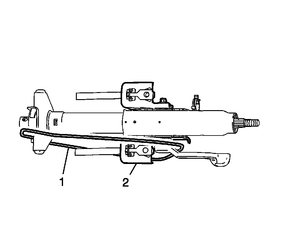 Note: Install tie straps (1) between the tilt lever bracket (2) and the base of the steering column to prevent the steering column jacket from pulling apart. The tilt lever MUST be in the LOCK (FULL UP) position during the steering column removal and installation to ensure that the tilt lever bracket remains rigid. Also install tie straps around the tilt lever and the steering column jacket to keep the tilt lever in the LOCK position. Do not bend the steering column energy absorbing straps located on the upper steering column mounting bracket.