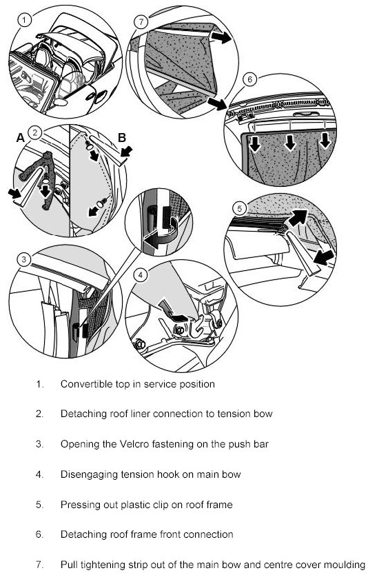8.1. Detach the convertible top covering -inset A- at the front and sides of the roof frame and fold to the rear, refer to Replacing convertible-top covering