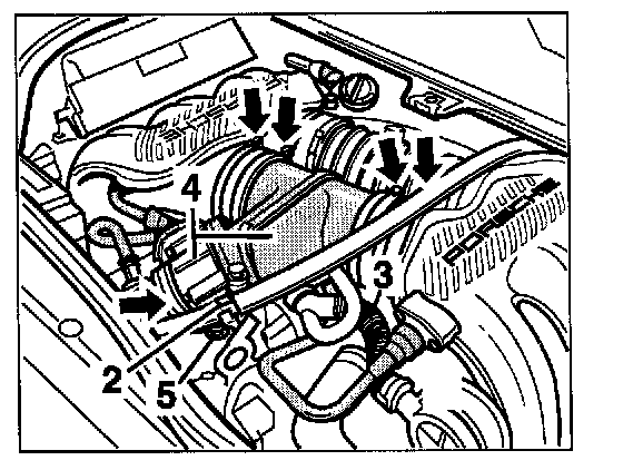 2. Disengage the cable -2- and then unlock and disconnect the hose -3- on both sides. Remove the intake pipe centre piece and the throttle body -4-. To do so, undo the hose clamps -arrows- and the fastening nut -5-.