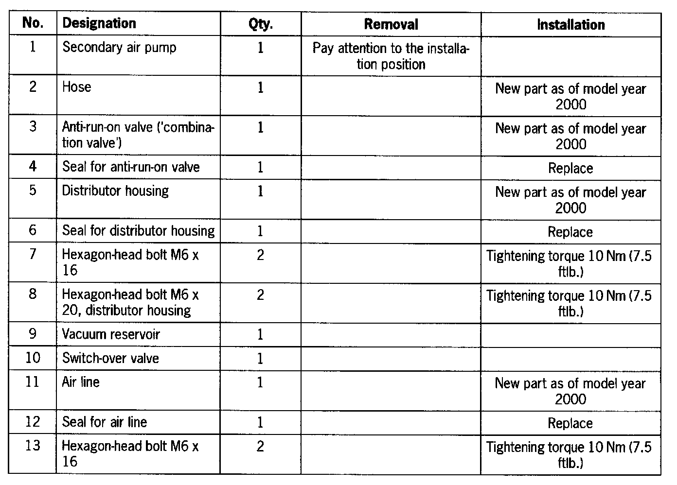 If the anti-run-on valve or the check valve are defective, the secondary air system must be converted to the system used as of model year 2000, see Carrera Technical Information 1/02 2669. A list of new or omitted parts is attached to the aforementioned Technical Information document.