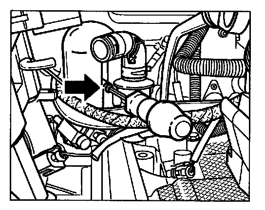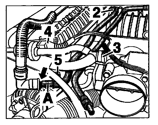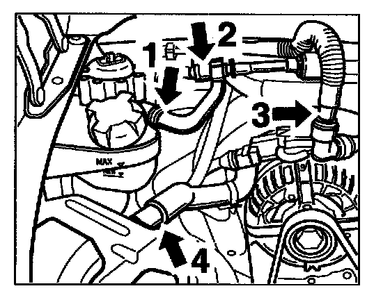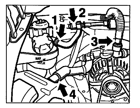 7. Remove coolant bleeder hose -arrow- by undoing the spring-band clamp and then pulling off the hose. Collect any draining water.