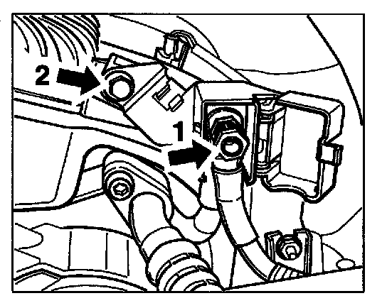 b. Disconnect battery positive lead -1- at B+ disconnection point. Unscrew the hexagon nut M8 and remove the positive lead. Then unscrew the hexagon-head bolt M6 x 12 -2- at the holder and lay the holder and box to one side.