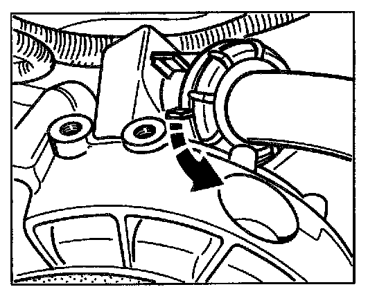 15. Install coolant bleeder hose -arrow- by pushing on the springband clamp and fastening the hose to the plastic flange.