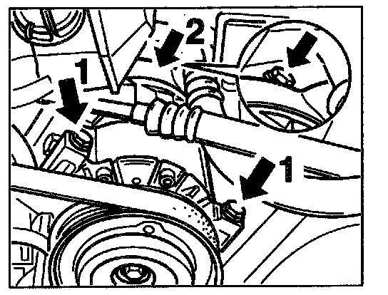d. Remove the air-conditioning compressor. Tool recommendation: 1/4 inch -Figure d3-. 3 hexagon-head bolts M8: Unscrew 2 bolts at rear -1-, 1 at front -2-. For better access to the front threaded part -2-, remove the engine compartment temperature sensor with the rubber sleeve at the right intake distributor.