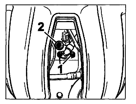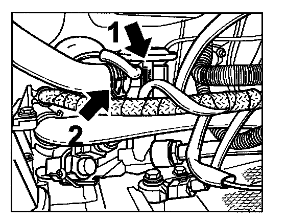 8. Fit new hose to the secondary air pump using a spring-band clamp at the combination valve -2- and connect the vacuum hose -1- to the combination valve.