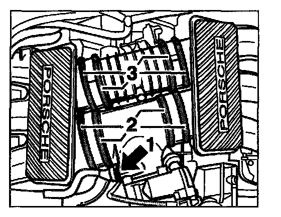 15. On cylinder bank 1 - 3, remove the wire retainer from the intake pipe -3- by unclipping the wiring harness and unscrewing the M6 hexagon-head bolt. Disconnect vacuum line from the anti-run-on valve -1-. Using spring-band pliers, remove the clamp from the hose to the secondary air pump -2- and pull off the hose.