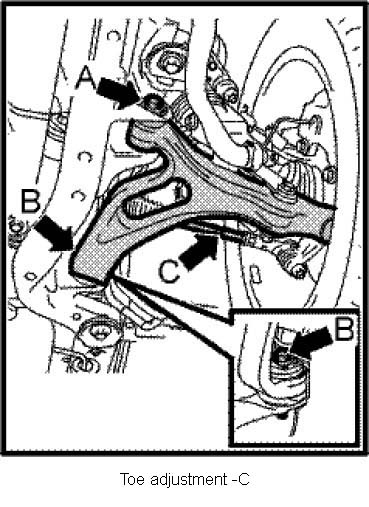 The toe is adjusted at the tie rod threaded joint for the tie rod/tie rod ball (ball joint) -C-.