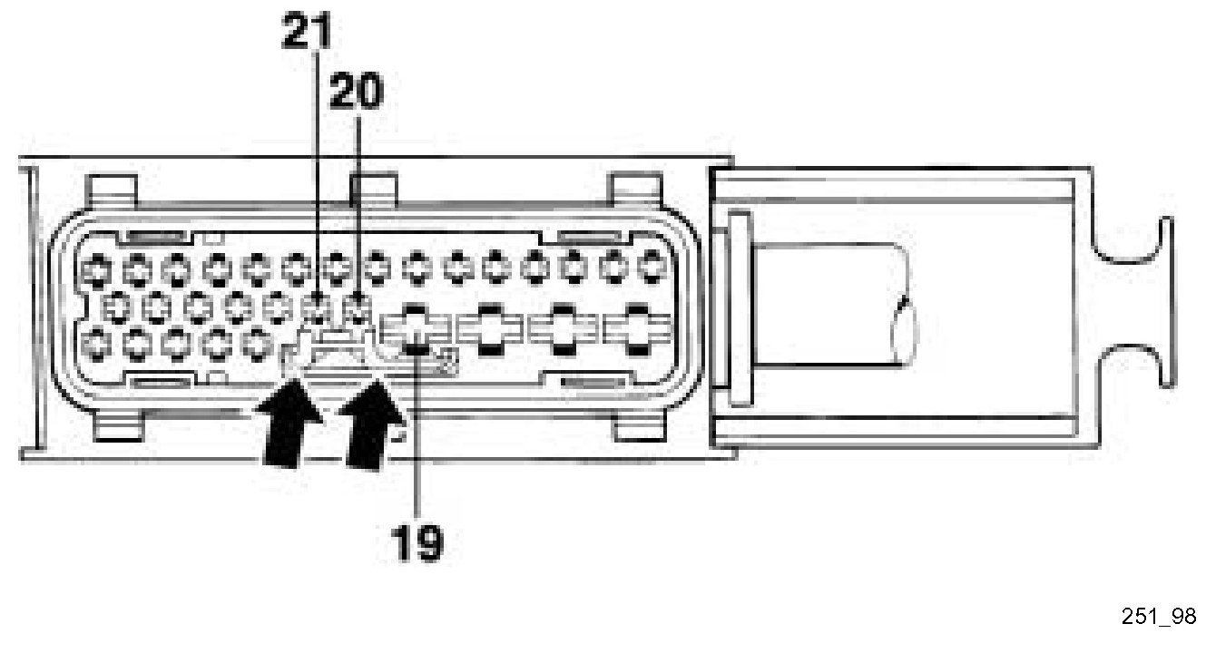 - Mechanical switching contacts (arrows) in the control module connector bent. As a consequence, these contacts are permanently connected to ground (ground of PIN 19 connected to PIN 20 and PIN 21).