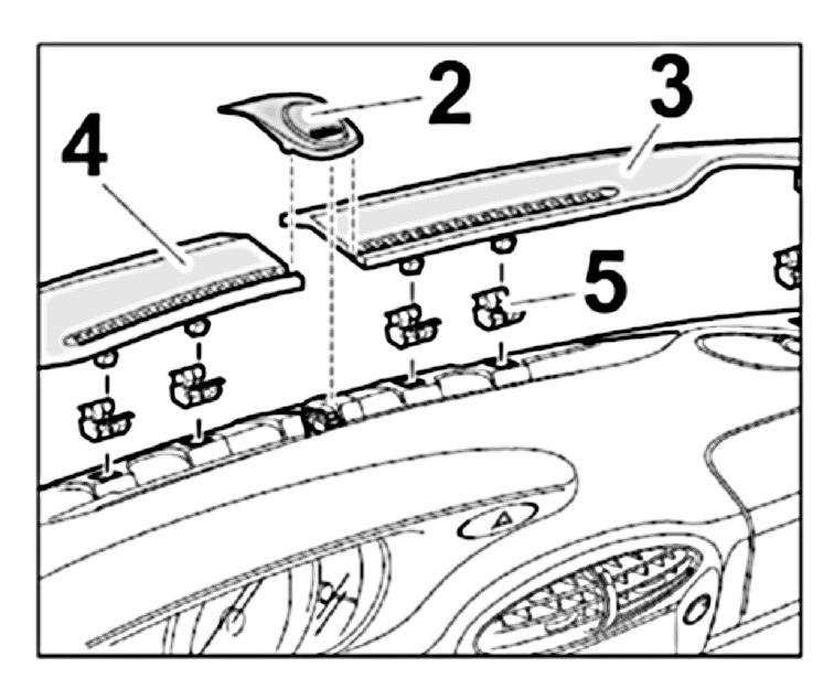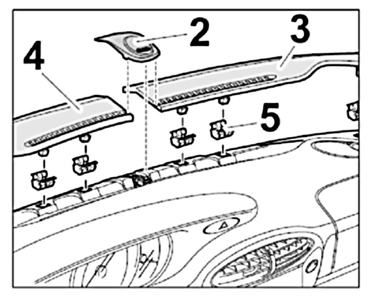 2.1. Check the fastening clips -5- , replace if necessary. Insert the defroster covers left and right -3 and 4- and clip in under the alarm readiness lug. Clip in alarm readiness light -2-.