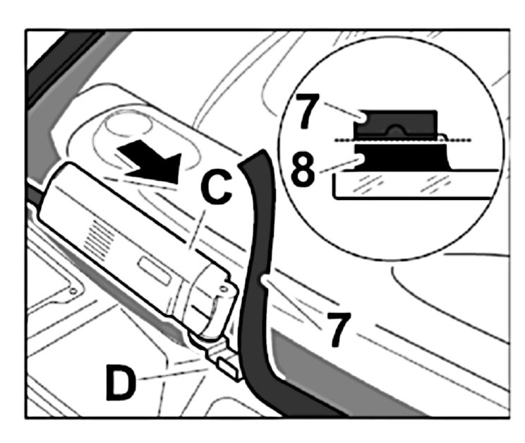 1.1. When removing remaining adhesive -7- with the cutting tool -C- and the flashing knife -D- on the body, ensure that a surface coating of adhesive remains -8-.