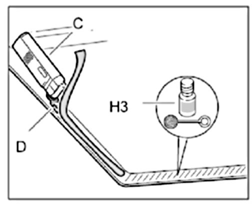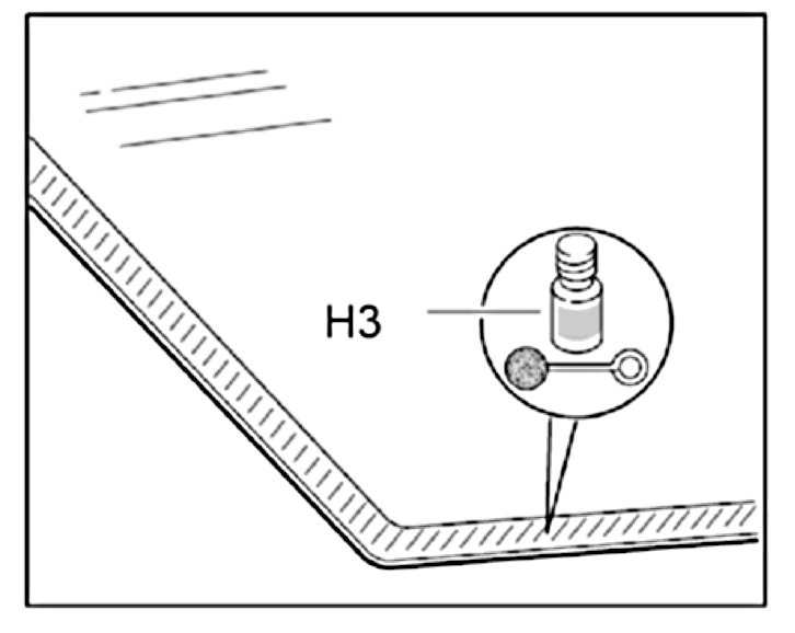 2.1. Clean new paint areas or damage to the top coat paint in the non-visible area of the glass section in the body with cleaning solution -H1- and patch with primer -H2-.