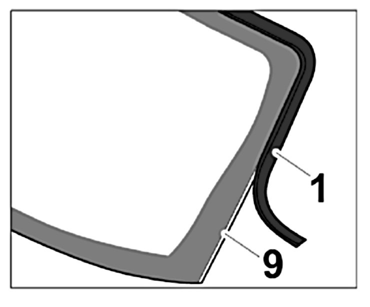 2.1. Place surrounding section -9- on the windscreen and press cover section -1- into the groove of the surrounding section.