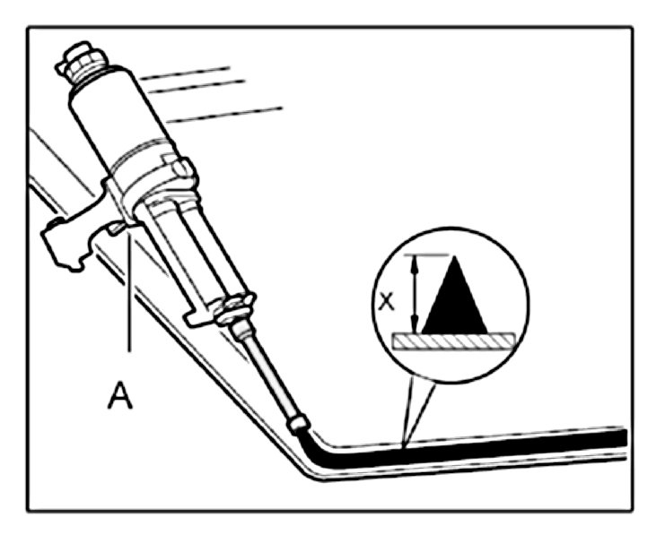 4.1. Apply 2-component bonding material with the adhesive gun -A- to the windscreen along the cover section as a triangular bead measuring -X = approx. 15 mm-.