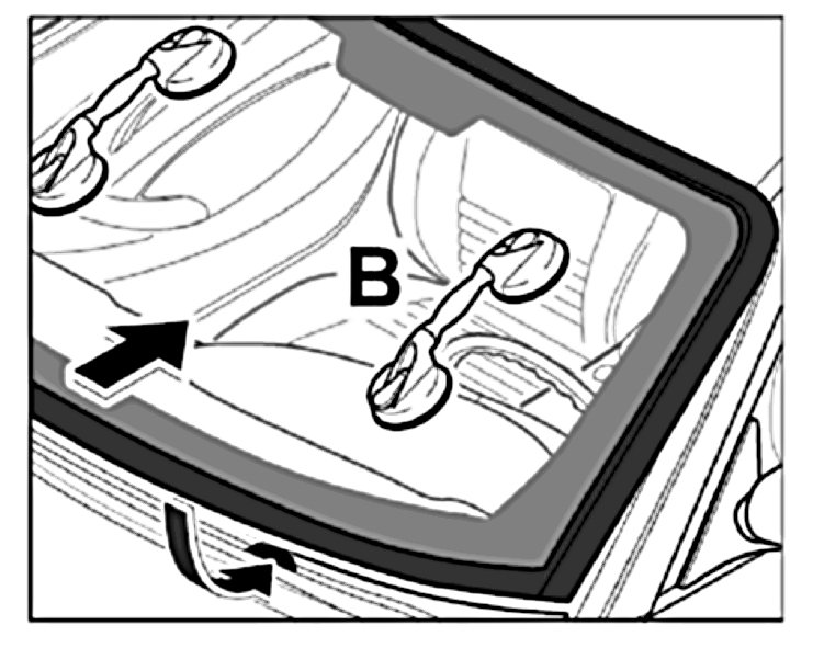 5.1. Apply suction cups -B- to the windscreen and insert the windscreen into the window aperture. Press the windscreen up as far as it will go. When doing so, press the lower edge of the glass against the spacer blocks.