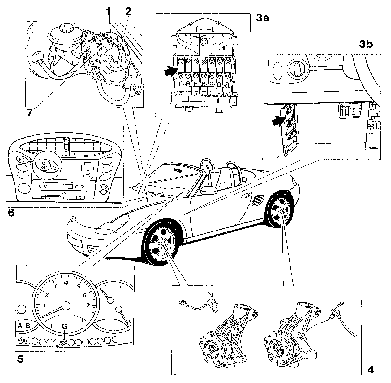 3b. The 15-A fuse F 2/9 (field 2, No. 9) on the central electrical board protects the control module's electrical supply (ABS and ABS/TC). The arrow points to field 2.