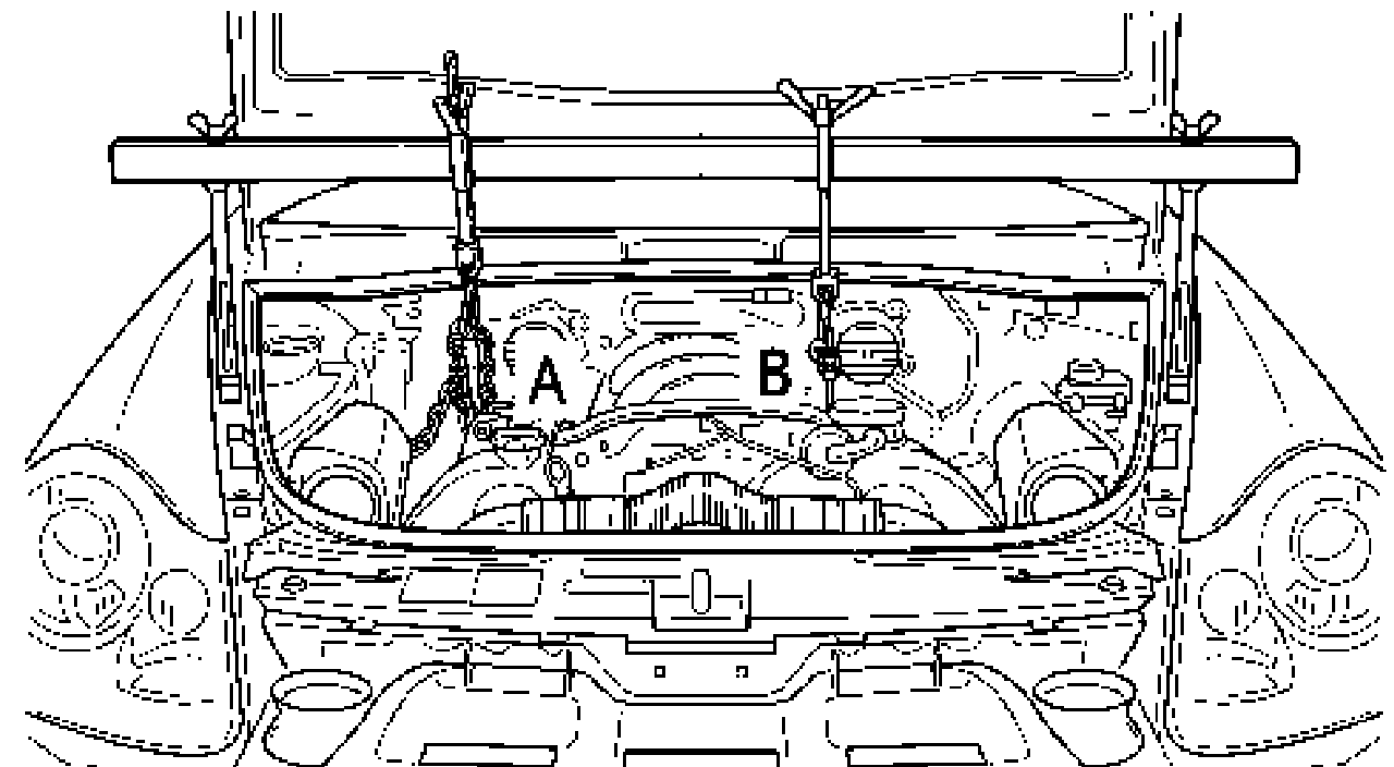11. Remove the safety device 10-222 A. To do this, remove the transport eyebolt 9700 -B- and the chain -A-, which is used to secure the engine.