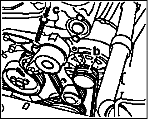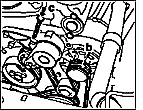 10. Unscrew the pressure screw -c- and tension the drive belt -arrow-.