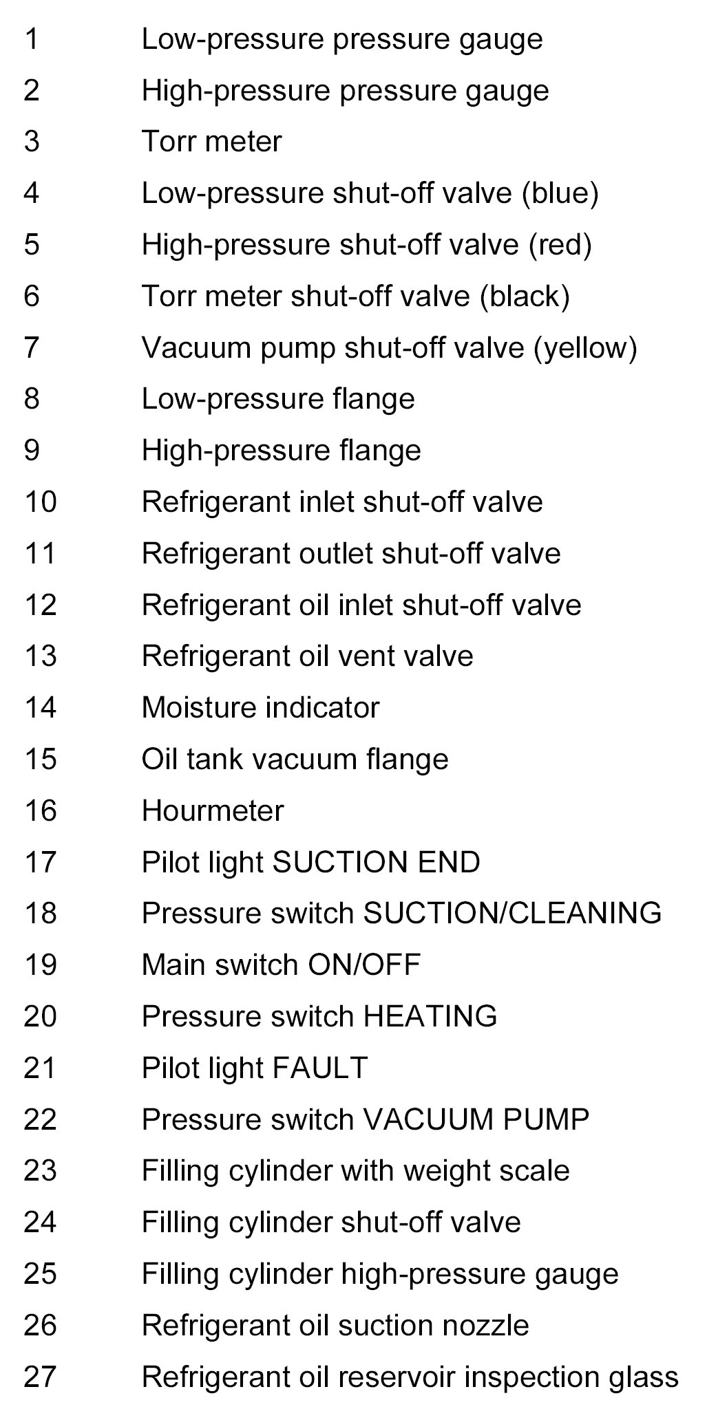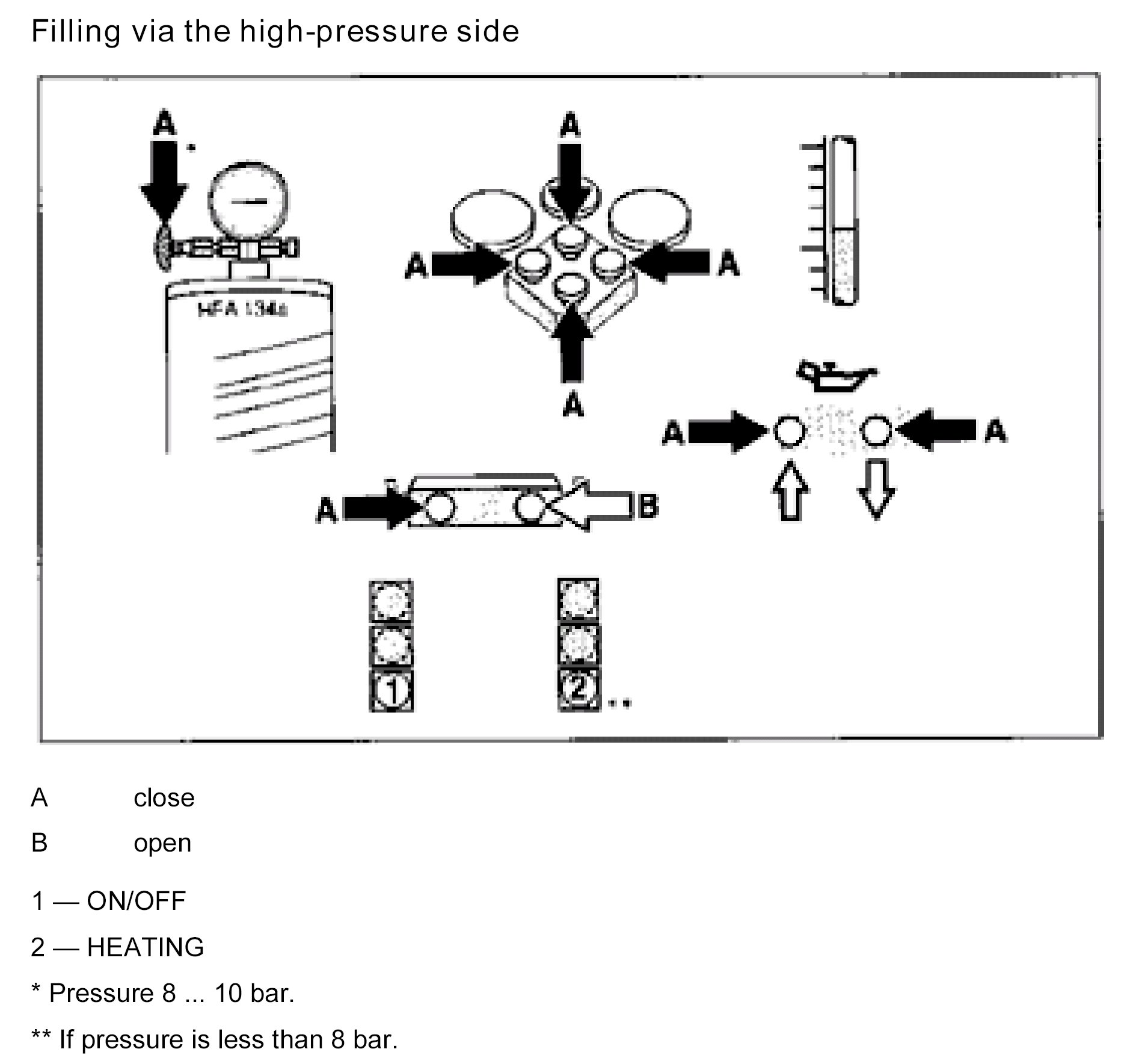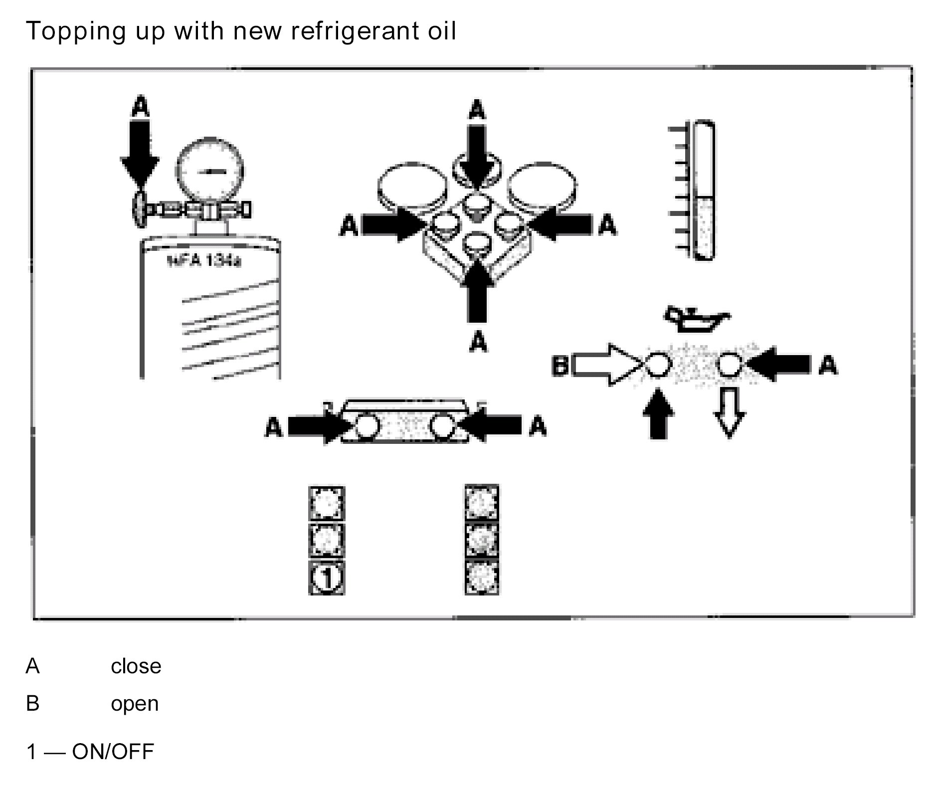 NOTE: In the event of insufficient refrigeration performance, remove the refrigerant by suction, top up with the stipulated quantity and check the system for leaks.